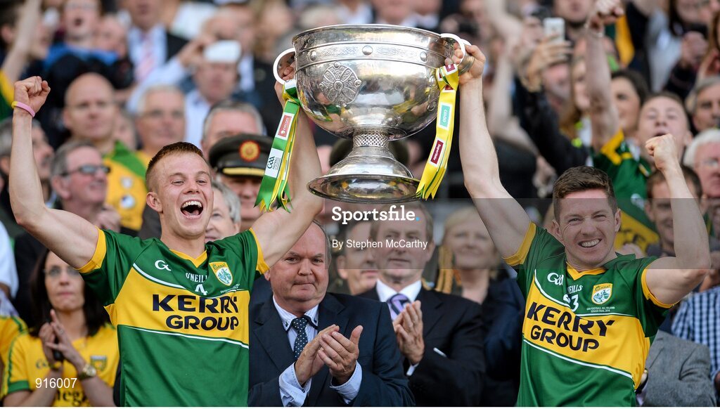 21 September 2014; Kerry joint captains Fionn Fitzgerald, left, and Kieran O'Leary lift the Sam Maguire cup. GAA Football All Ireland Senior Championship Final, Kerry v Donegal. Croke Park, Dublin. Picture credit: Stephen McCarthy / SPORTSFILE