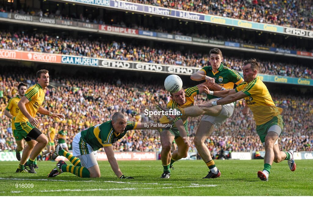 21 September 2014; Kerry's Paul Geaney, supported by team-mate Kieran Donaghy, left, gets his shot away despite the challenge of Donegal's Neil Gallagher, left, and Karl lacey, right. GAA Football All Ireland Senior Championship Final, Kerry v Donegal. Croke Park, Dublin. Picture credit: Pat Murphy / SPORTSFILE