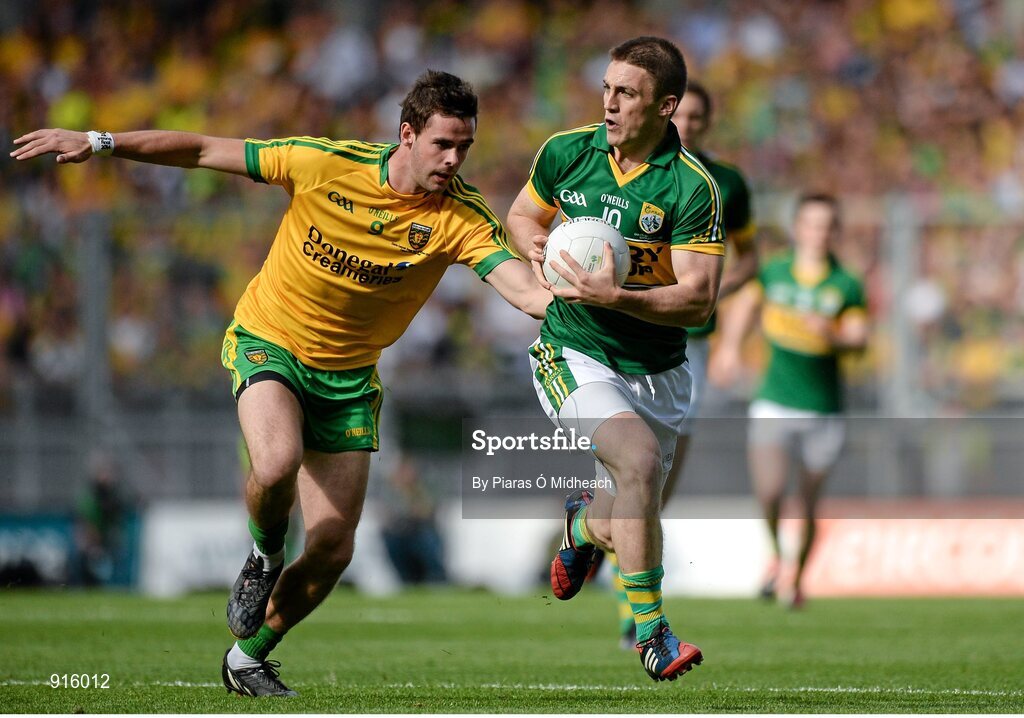 21 September 2014; Stephen O'Brien, Kerry, in action against Odhrán Mac Niallais, Donegal. GAA Football All Ireland Senior Championship Final, Kerry v Donegal. Croke Park, Dublin. Picture credit: Piaras Ó Mídheach / SPORTSFILE