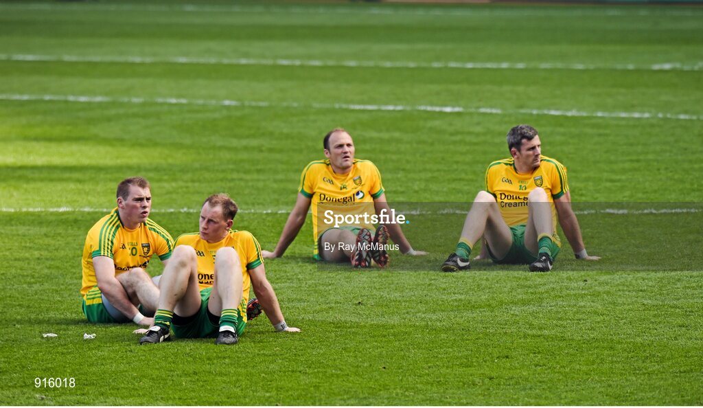 21 September 2014; Donegal players, Dermot Molloy, Anthony Thompson, Colm Anthony McFadden and Christy Toye, sit on the pitch after the game. GAA Football All Ireland Senior Championship Final, Kerry v Donegal. Croke Park, Dublin. Picture credit: Ray McManus / SPORTSFILE