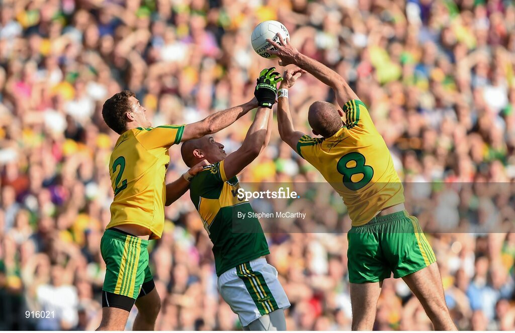 21 September 2014; Kieran Donaghy, Kerry, in action against Eamonn McGee, left, and Neil Gallagher, right, Donegal. GAA Football All Ireland Senior Championship Final, Kerry v Donegal. Croke Park, Dublin. Picture credit: Stephen McCarthy / SPORTSFILE