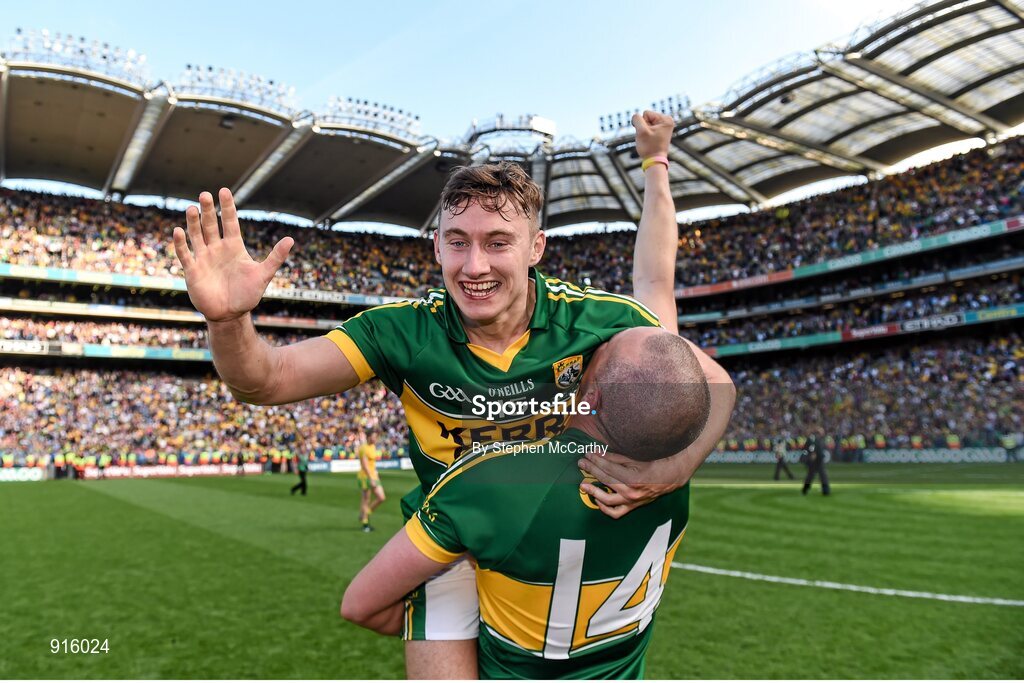 21 September 2014; James O'Donoghue, left, and Kieran Donaghy, Kerry, celebrate following their side's victory. GAA Football All Ireland Senior Championship Final, Kerry v Donegal. Croke Park, Dublin. Picture credit: Stephen McCarthy / SPORTSFILE
