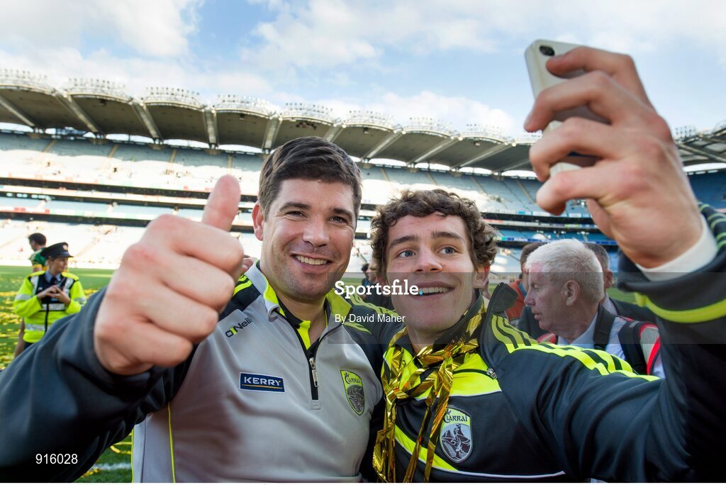 21 September 2014; Kerry manager Eamonn Fitzmaurice celebrates with winning minor corner forward Tomas Ó Sé, at the end of the game. GAA Football All Ireland Senior Championship Final, Kerry v Donegal. Croke Park, Dublin. Picture credit: David Maher / SPORTSFILE