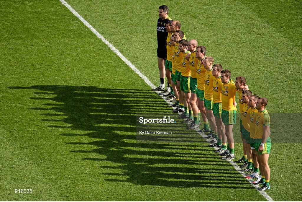 21 September 2014; The Donegal team stand together for the National Anthem. GAA Football All Ireland Senior Championship Final, Kerry v Donegal. Croke Park, Dublin. Picture credit: Dáire Brennan / SPORTSFILE
