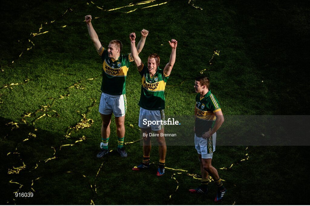 21 September 2014; Kerry players, from left, Peter Crowley, Fionn Fitzgerald, and Shane Enright celebrate on the pitch after the game. GAA Football All Ireland Senior Championship Final, Kerry v Donegal. Croke Park, Dublin. Picture credit: Dáire Brennan / SPORTSFILE