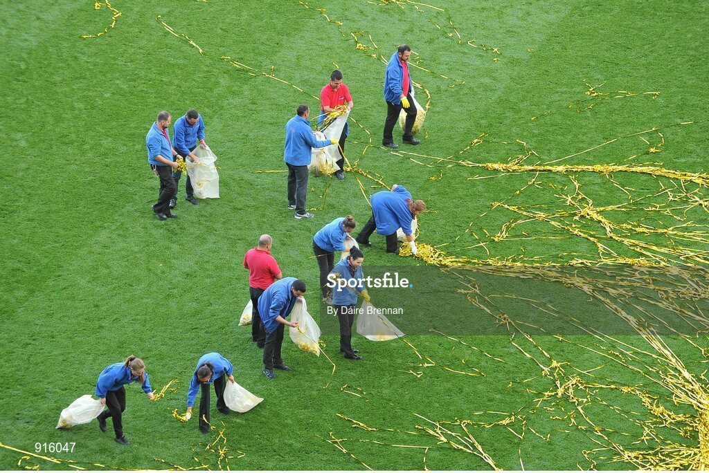 21 September 2014; Workers clean up the gold streamers from the pitch after the game. GAA Football All Ireland Senior Championship Final, Kerry v Donegal. Croke Park, Dublin. Picture credit: Dáire Brennan / SPORTSFILE