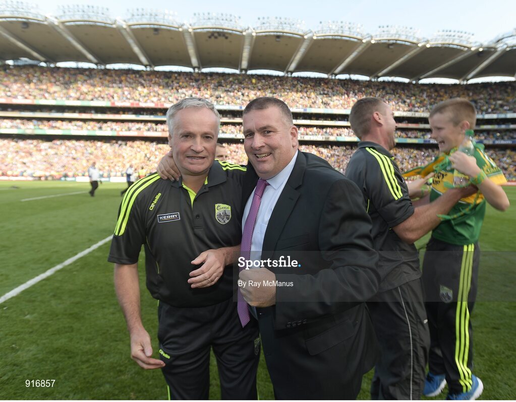 21 September 2014; Kerry selector Mikey Sheehy, left, and Kerry County Board Chairman Patrick O'Sullivan, celebrate after the game. GAA Football All Ireland Senior Championship Final, Kerry v Donegal. Croke Park, Dublin. Picture credit: Ray McManus / SPORTSFILE