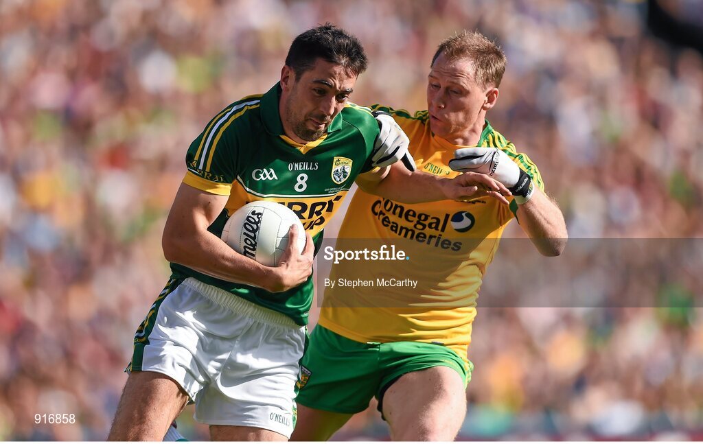 21 September 2014; Anthony Maher, Kerry, in action against Anthony Thompson, Donegal. GAA Football All Ireland Senior Championship Final, Kerry v Donegal. Croke Park, Dublin. Picture credit: Stephen McCarthy / SPORTSFILE