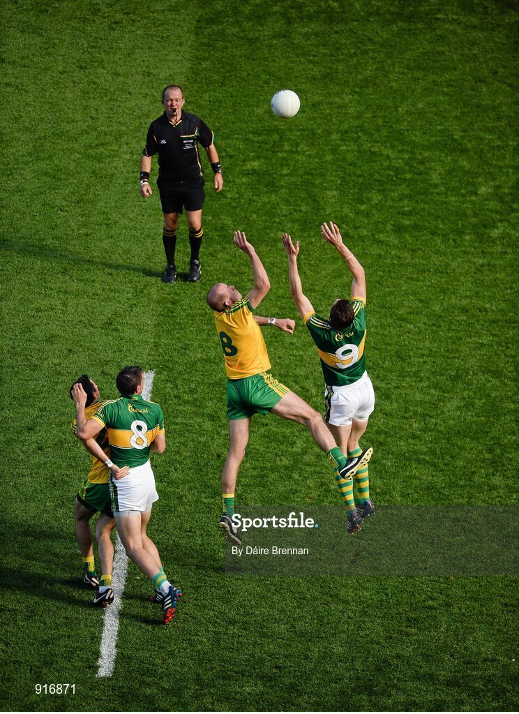 21 September 2014; Anthony Maher, left, and David Moran, Kerry, compete for the throw-in against Neil Gallagher, right, and Rory Kavanagh, Donegal. GAA Football All Ireland Senior Championship Final, Kerry v Donegal. Croke Park, Dublin. Picture credit: Dáire Brennan / SPORTSFILE