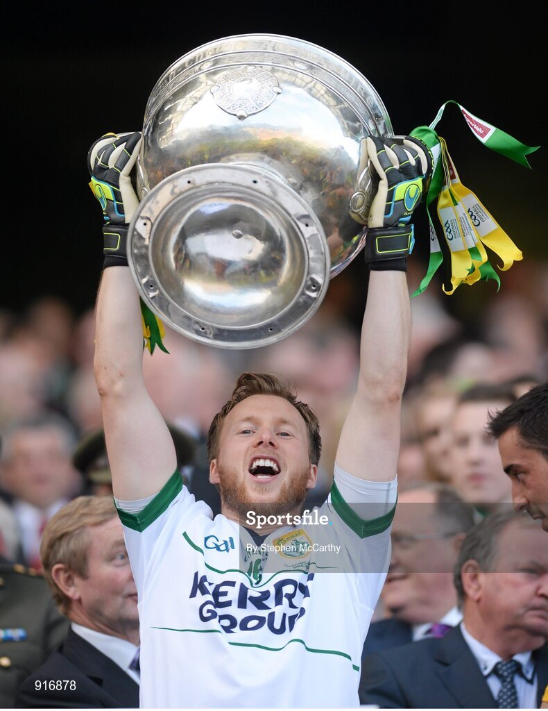 21 September 2014; Kerry's Brendan Kealy lifts the Sam Maguire cup. GAA Football All Ireland Senior Championship Final, Kerry v Donegal. Croke Park, Dublin. Picture credit: Stephen McCarthy / SPORTSFILE