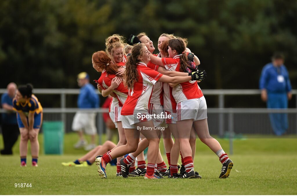 27 September 2014; Kilkerrin Clonberne, Galway, players celebrate victory in the Senior Championship match after the final whistle. 2014 TESCO HomeGrown All-Ireland Ladies Football Club Sevens Finals. Naomh Mearnóg GAA Club, Portmarnock, Co. Dublin. Picture credit: Barry Cregg / SPORTSFILE