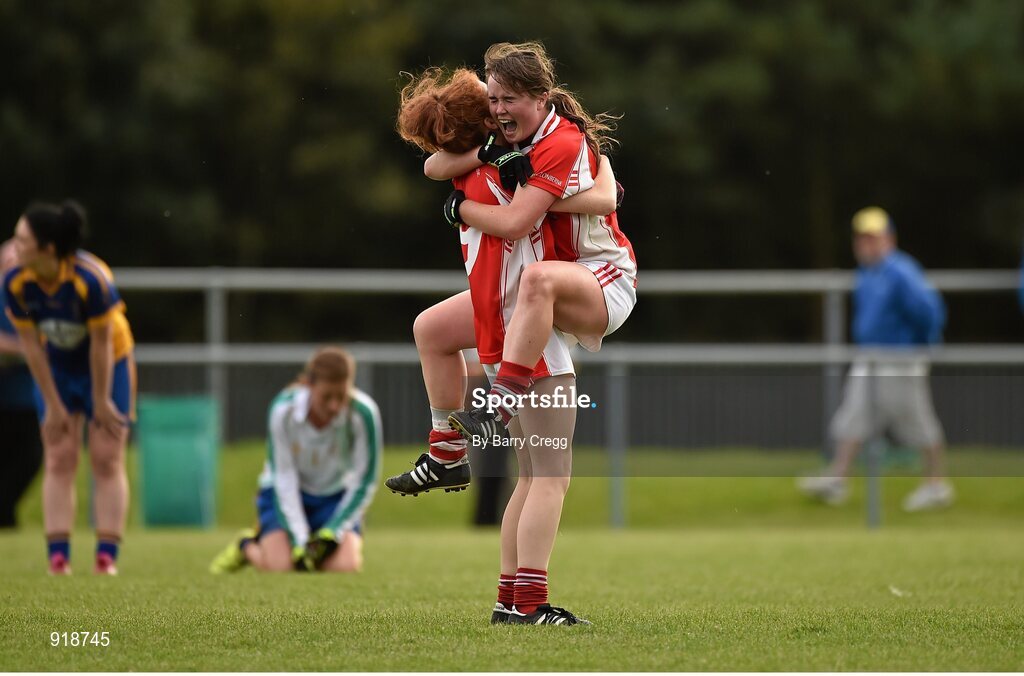 27 September 2014; Caoimhe Boyle, left, and Nicola Ward, Kilkerrin Clonberne, Galway, celebrate victory in the Senior Championship match after the final whistle. 2014 TESCO HomeGrown All-Ireland Ladies Football Club Sevens Finals. Naomh Mearnóg GAA Club, Portmarnock, Co. Dublin. Picture credit: Barry Cregg / SPORTSFILE