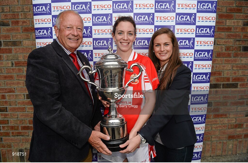 27 September 2014; Kilkerrin Clonberne, Galway, captain Aoife McStay receives the Senior cup from Pat Quill, President, Ladies Gaelic Football Association, and Lynn Moynihan, Local Marketing Manager, Tesco Ireland. 2014 TESCO HomeGrown All-Ireland Ladies Football Club Sevens Finals. Naomh Mearnóg GAA Club, Portmarnock, Co. Dublin. Picture credit: Barry Cregg / SPORTSFILE