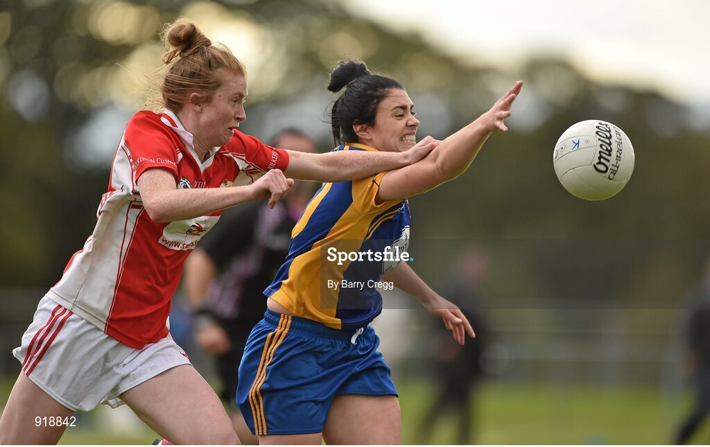 27 September 2014; Ciara Dempsey, Parnells, London, in action against Louise Ward, Kilkerrin Clonberne, Galway, during the Senior Championship final. 2014 TESCO HomeGrown All-Ireland Ladies Football Club Sevens Finals. Naomh Mearnóg GAA Club, Portmarnock, Co. Dublin. Picture credit: Barry Cregg / SPORTSFILE