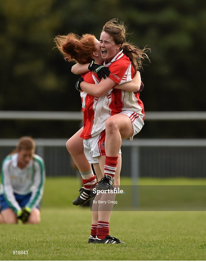 27 September 2014; Caoimhe Boyle, left, and Nicola Ward, Kilkerrin Clonberne, Galway, celebrate victory in the Senior Championship match after the final whistle. 2014 TESCO HomeGrown All-Ireland Ladies Football Club Sevens Finals. Naomh Mearnóg GAA Club, Portmarnock, Co. Dublin. Picture credit: Barry Cregg / SPORTSFILE