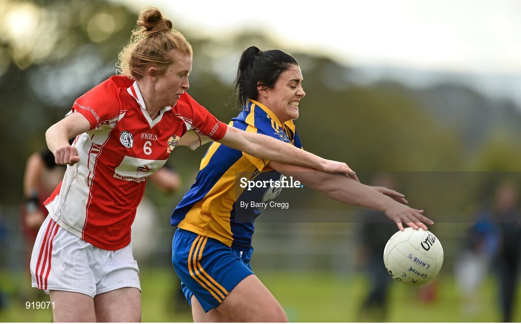 27 September 2014; Ciara Dempsey, Parnells, London, in action against Louise Ward, Kilkerrin Clonberne, Galway, during the Senior Championship final. 2014 TESCO HomeGrown All-Ireland Ladies Football Club Sevens Finals. Naomh Mearnóg GAA Club, Portmarnock, Co. Dublin. Picture credit: Barry Cregg / SPORTSFILE