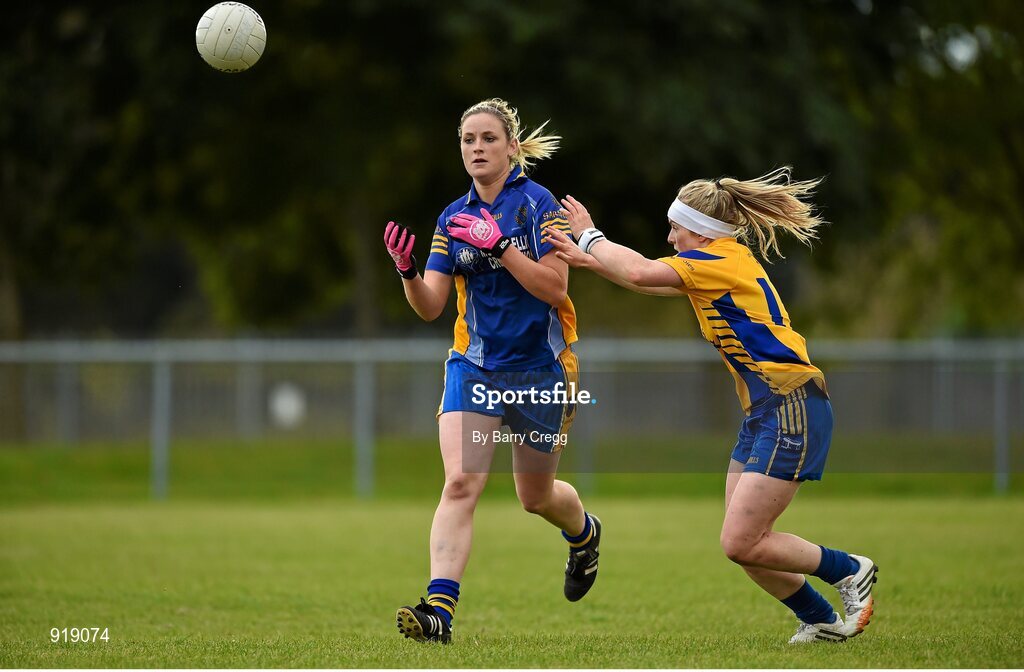 27 September 2014; Jenny McEvoy, Mountmellick Sarsfields, Laois, in action against, Naomi Carroll, Banner, Clare. 2014 TESCO HomeGrown All-Ireland Ladies Football Club Sevens Finals. Naomh Mearnóg GAA Club, Portmarnock, Co. Dublin. Picture credit: Barry Cregg / SPORTSFILE