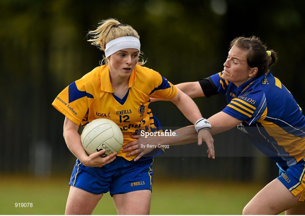 27 September 2014; Naomi Carroll, Banner, Clare, in action against, Emma McEvoy, Mountmellick Sarsfields, Laois. 2014 TESCO HomeGrown All-Ireland Ladies Football Club Sevens Finals. Naomh Mearnóg GAA Club, Portmarnock, Co. Dublin. Picture credit: Barry Cregg / SPORTSFILE
