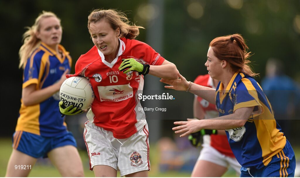 27 September 2014; Lisa Walsh, Kilkerrin Clonberne, Galway, in action against Sinéad O'Mahony, Parnells, London, during the Senior Championship final. 2014 TESCO HomeGrown All-Ireland Ladies Football Club Sevens Finals. Naomh Mearnóg GAA Club, Portmarnock, Co. Dublin. Picture credit: Barry Cregg / SPORTSFILE