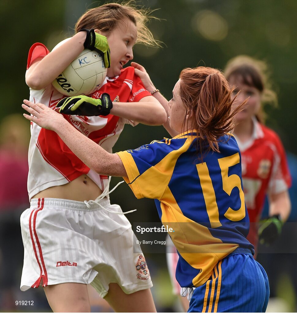 27 September 2014; Lisa Walsh, Kilkerrin Clonberne, Galway, in action against Sinéad O'Mahony, Parnells, London, during the Senior Championship final. 2014 TESCO HomeGrown All-Ireland Ladies Football Club Sevens Finals. Naomh Mearnóg GAA Club, Portmarnock, Co. Dublin. Picture credit: Barry Cregg / SPORTSFILE