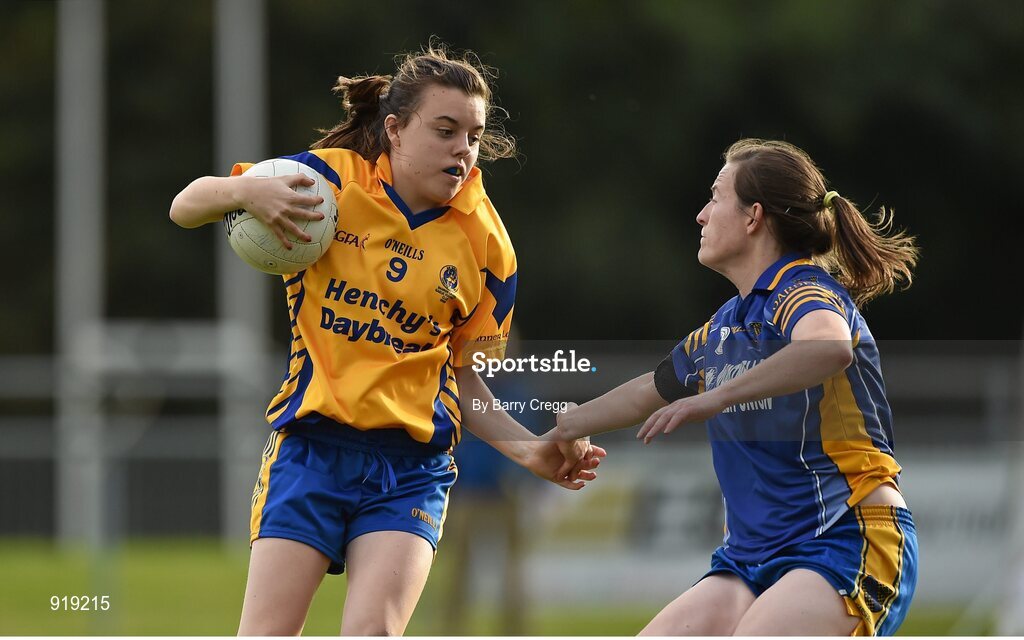 27 September 2014; Grainne Nolan, Banner, Clare, in action against, Tracey Lawlor, Mountmellick Sarsfields, Laois. 2014 TESCO HomeGrown All-Ireland Ladies Football Club Sevens Finals. Naomh Mearnóg GAA Club, Portmarnock, Co. Dublin. Picture credit: Barry Cregg / SPORTSFILE