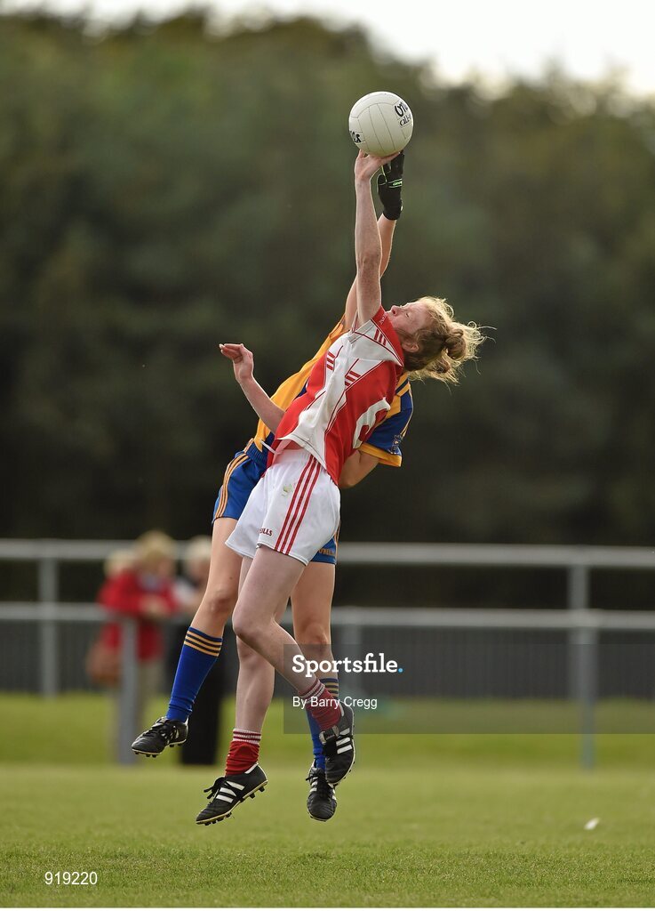 27 September 2014; Louise Ward, Kilkerrin Clonberne, Galway, in action against Helen Carroll, Parnells, London, during the Senior Championship final. 2014 TESCO HomeGrown All-Ireland Ladies Football Club Sevens Finals. Naomh Mearnóg GAA Club, Portmarnock, Co. Dublin. Picture credit: Barry Cregg / SPORTSFILE