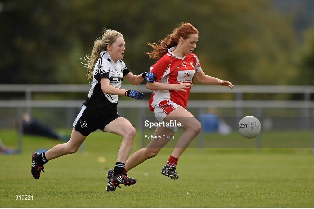 27 September 2014; Olivia Divilly, Kilkerrin Clonberne, Galway, in action against Eimear McAnespie, Emyvale, Monaghan. 2014 TESCO HomeGrown All-Ireland Ladies Football Club Sevens Finals. Naomh Mearnóg GAA Club, Portmarnock, Co. Dublin. Picture credit: Barry Cregg / SPORTSFILE