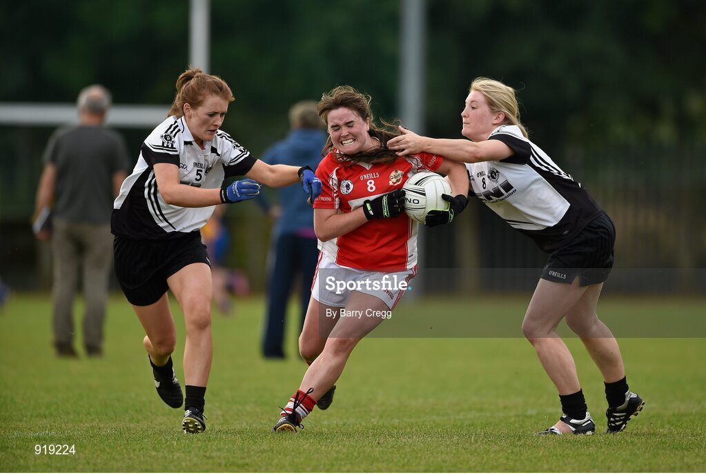27 September 2014; Nicola Ward, Kilkerrin Clonberne, Galway, in action against Nicola Fahy, left, and Una McNally, Emyvale, Monaghan. 2014 TESCO HomeGrown All-Ireland Ladies Football Club Sevens Finals. Naomh Mearnóg GAA Club, Portmarnock, Co. Dublin. Picture credit: Barry Cregg / SPORTSFILE