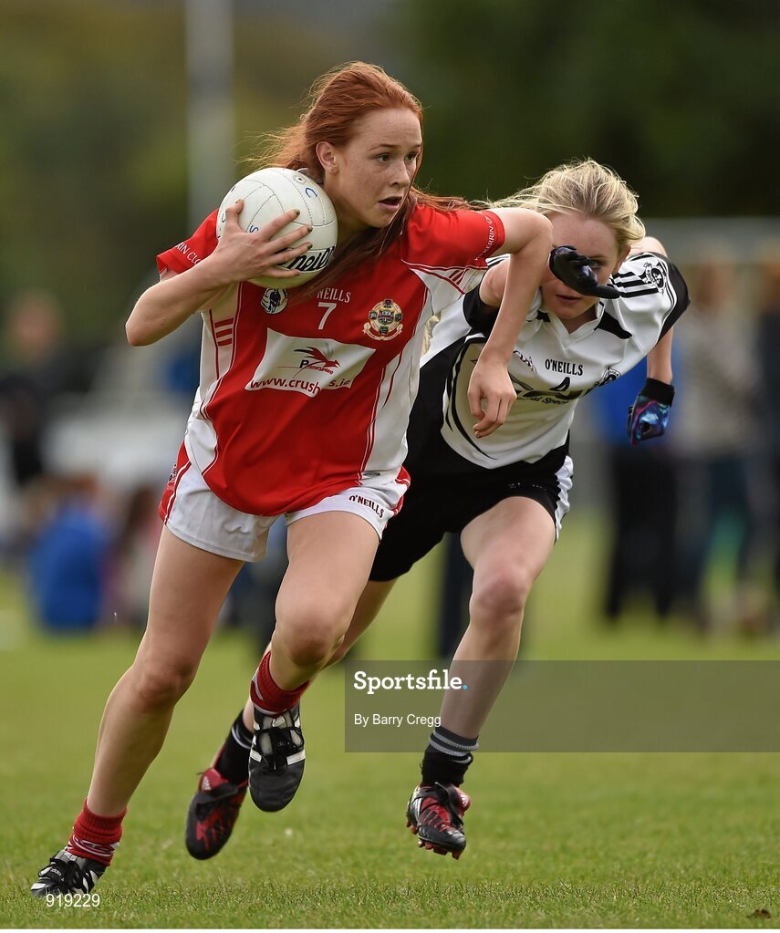 27 September 2014; Olivia Divilly, Kilkerrin Clonberne, Galway, in action against Eimear McAnespie, Emyvale, Monaghan. 2014 TESCO HomeGrown All-Ireland Ladies Football Club Sevens Finals. Naomh Mearnóg GAA Club, Portmarnock, Co. Dublin. Picture credit: Barry Cregg / SPORTSFILE