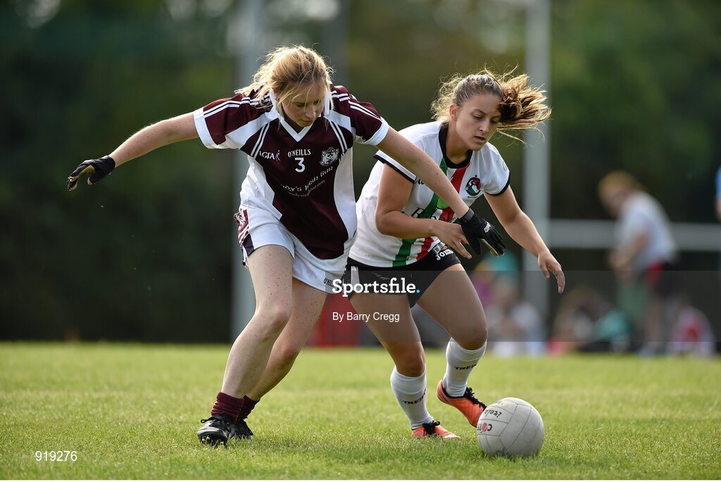 27 September 2014; Michelle Johnston, Thomas McCurtains, London, in action against Alba Rodriguez Sanchez, An Eoraip. 2014 TESCO HomeGrown All-Ireland Ladies Football Club Sevens Finals. Naomh Mearnóg GAA Club, Portmarnock, Co. Dublin. Picture credit: Barry Cregg / SPORTSFILE