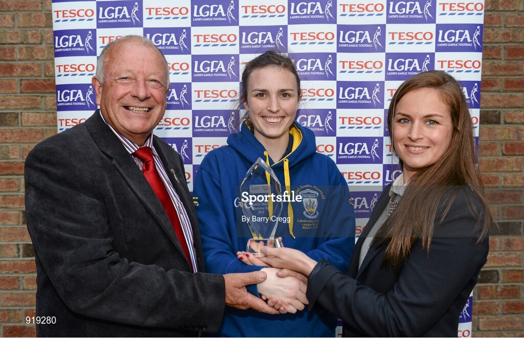 27 September 2014; Ciara Sheridan, Man O War, Dublin, receives the Junior Sheild Runners Up award from Pat Quill, President, Ladies Gaelic Football Association, and Lynn Moynihan, Local Marketing Manager, Tesco Ireland. 2014 TESCO HomeGrown All-Ireland Ladies Football Club Sevens Finals. Naomh Mearnóg GAA Club, Portmarnock, Co. Dublin. Picture credit: Barry Cregg / SPORTSFILE