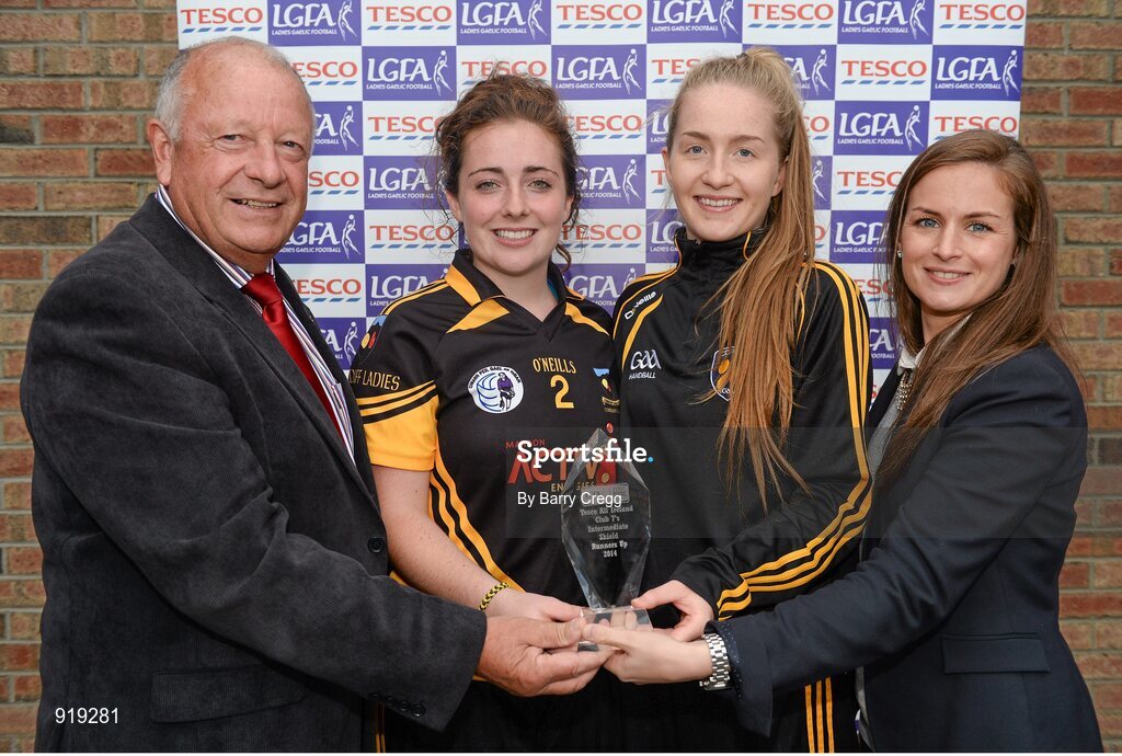 27 September 2014; Laura McEnaney, left, and Kate Brennan, Corduff, Monaghan, receive the Intermediate Shield Runners Up award from Pat Quill, President, Ladies Gaelic Football Association, and Lynn Moynihan, Local Marketing Manager, Tesco Ireland. 2014 TESCO HomeGrown All-Ireland Ladies Football Club Sevens Finals. Naomh Mearnóg GAA Club, Portmarnock, Co. Dublin. Picture credit: Barry Cregg / SPORTSFILE