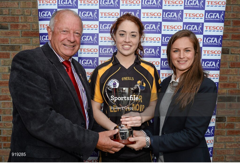 27 September 2014; Sarah Ní Loingshigh, Naomh Anna, Galway, receives the Junior cup from Pat Quill, President, Ladies Gaelic Football Association, and Lynn Moynihan, Local Marketing Manager, Tesco Ireland. 2014 TESCO HomeGrown All-Ireland Ladies Football Club Sevens Finals. Naomh Mearnóg GAA Club, Portmarnock, Co. Dublin. Picture credit: Barry Cregg / SPORTSFILE