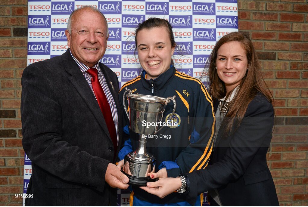 27 September 2014; Grainne Nolan, Banner, Clare, receives the Senior Shield cup award from Pat Quill, President, Ladies Gaelic Football Association, and Lynn Moynihan, Local Marketing Manager, Tesco Ireland. 2014 TESCO HomeGrown All-Ireland Ladies Football Club Sevens Finals. Naomh Mearnóg GAA Club, Portmarnock, Co. Dublin. Picture credit: Barry Cregg / SPORTSFILE