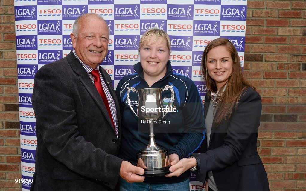 27 September 2014; Aoife Monaghan, Miltown, Galway, receives the Intermediate Shield cup from Pat Quill, President, Ladies Gaelic Football Association, and Lynn Moynihan, Local Marketing Manager, Tesco Ireland. 2014 TESCO HomeGrown All-Ireland Ladies Football Club Sevens Finals. Naomh Mearnóg GAA Club, Portmarnock, Co. Dublin. Picture credit: Barry Cregg / SPORTSFILE