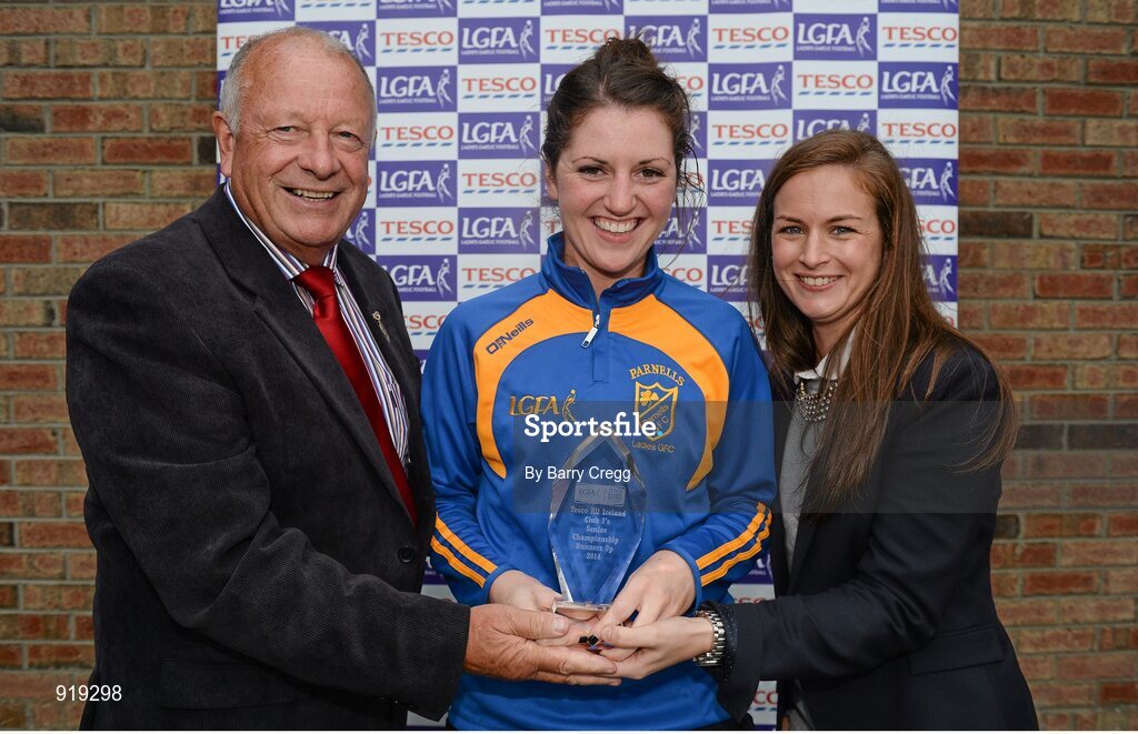 27 September 2014; Renee Murphy, Parnells. London, receives the Senior Shield Runners up award from Pat Quill, President, Ladies Gaelic Football Association, and Lynn Moynihan, Local Marketing Manager, Tesco Ireland. 2014 TESCO HomeGrown All-Ireland Ladies Football Club Sevens Finals. Naomh Mearnóg GAA Club, Portmarnock, Co. Dublin. Picture credit: Barry Cregg / SPORTSFILE