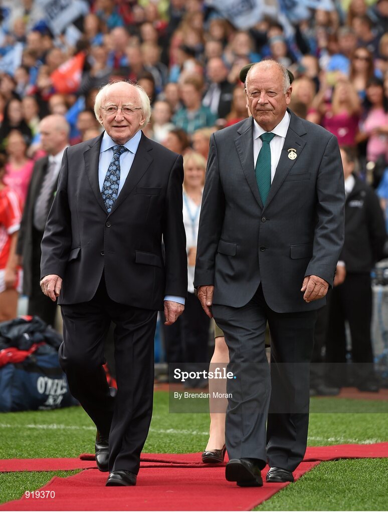 28 September 2014; The President of Ireland Michael D. Higgins, left, is accompanied by Pat Quill, President of the Ladies Gaelic Football Association, before he is introduced to the teams before the game. TG4 All-Ireland Ladies Football Senior Championship Final, Cork v Dublin. Croke Park, Dublin. Picture credit: Brendan Moran / SPORTSFILE