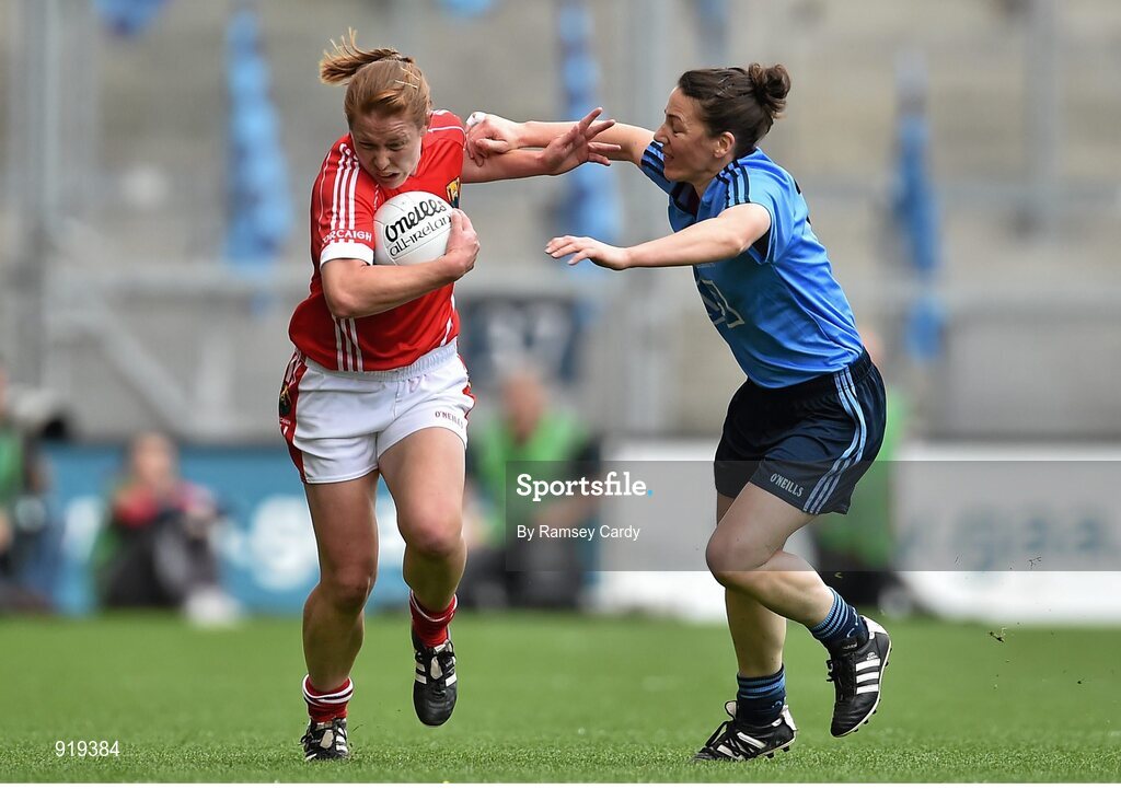 28 September 2014; Rena Buckley, Cork, in action against Denise Masterson, Dublin. TG4 All-Ireland Ladies Football Senior Championship Final, Cork v Dublin. Croke Park, Dublin. Picture credit: Ramsey Cardy / SPORTSFILE
