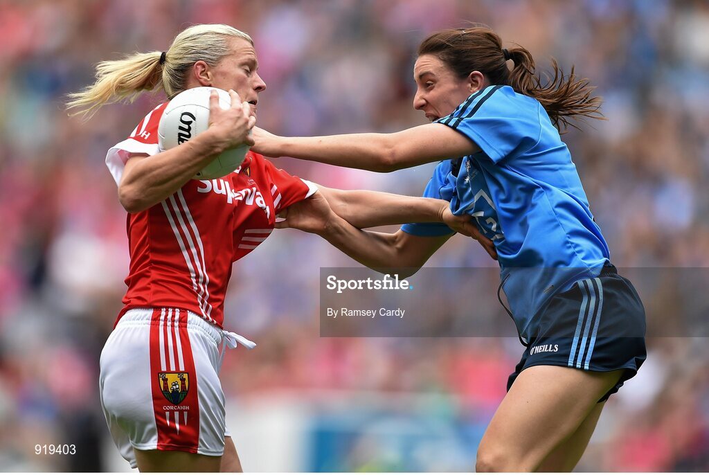 28 September 2014; Deirdre O'Reilly, Cork, in action against Siobhan McGrath, Dublin. TG4 All-Ireland Ladies Football Senior Championship Final, Cork v Dublin. Croke Park, Dublin. Picture credit: Ramsey Cardy / SPORTSFILE