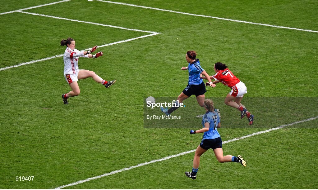 28 September 2014; Lindsay Peat shoots past Cork goalkeeper Martina O'Brien and Geraldine O'Flynn to score a goal for Dublin. TG4 All-Ireland Ladies Football Senior Championship Final, Cork v Dublin. Croke Park, Dublin. Picture credit: Ray McManus / SPORTSFILE