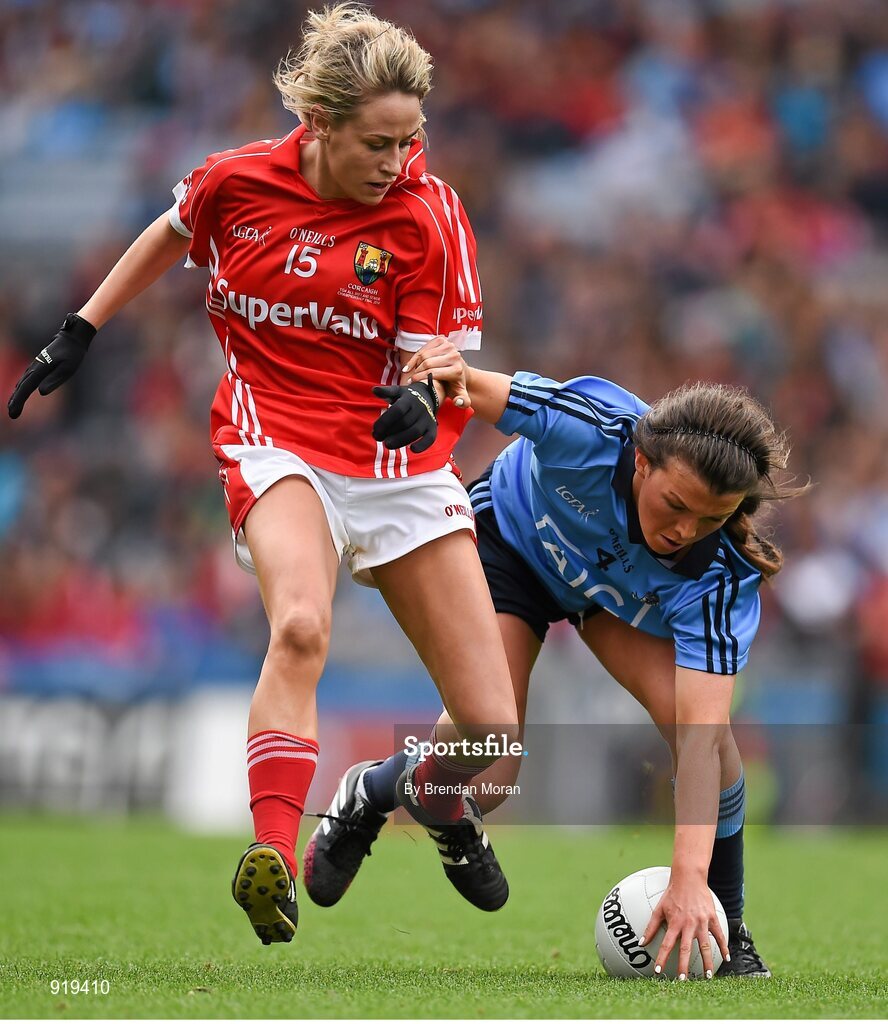 28 September 2014; Leah Caffrey, Dublin, in action against Orla Finn, Cork. TG4 All-Ireland Ladies Football Senior Championship Final, Cork v Dublin. Croke Park, Dublin. Picture credit: Brendan Moran / SPORTSFILE