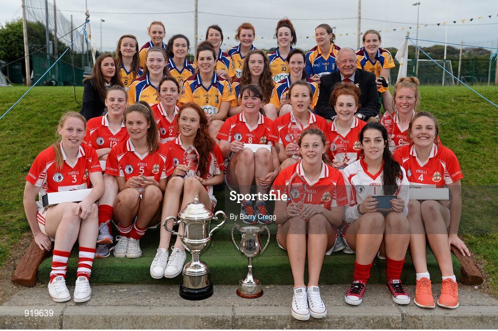 27 September 2014; Senior Championship winners Kilkerrin Clonberne, Galway and Intermediate Championship winners Glenamaddy/Williamstown, Galway, with Pat Quill, President, Ladies Gaelic Football Association, and Lynn Moynihan, Local Marketing Manager, Tesco Ireland. 2014 TESCO HomeGrown All-Ireland Ladies Football Club Sevens Finals. Naomh Mearnóg GAA Club, Portmarnock, Co. Dublin Picture credit: Barry Cregg / SPORTSFILE