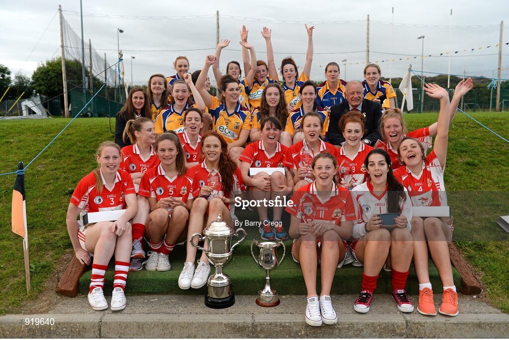 27 September 2014; Senior Championship winners Kilkerrin Clonberne, Galway and Intermediate Championship winners Glenamaddy/Williamstown, Galway, with Pat Quill, President, Ladies Gaelic Football Association, and Lynn Moynihan, Local Marketing Manager, Tesco Ireland. 2014 TESCO HomeGrown All-Ireland Ladies Football Club Sevens Finals. Naomh Mearnóg GAA Club, Portmarnock, Co. Dublin Picture credit: Barry Cregg / SPORTSFILE