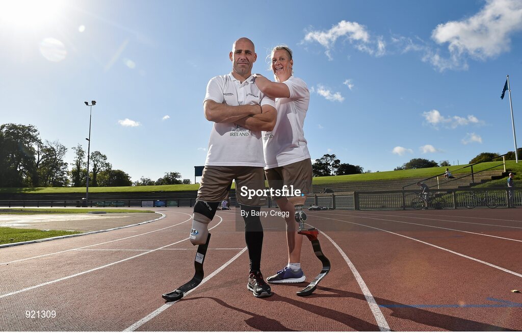 4 October 2014; Simon Baker, from Limerick, and Amanda King from Ballymun, Dublin, pictured at the first ever running blades workshop held in Ireland hosted by Paralympics Ireland in partnership with sponsors Mondelez, and blade manufacturer Ottobock. The unique event saw eight individuals who had been prefitted for the technology given the opportunity to experience and showcase the blades with almost a fifty additional prosthesis users and amputees taking part in activity session to promote Paralympic sport. Morton Stadium, Santry, Dublin. Picture credit: Barry Cregg / SPORTSFILE