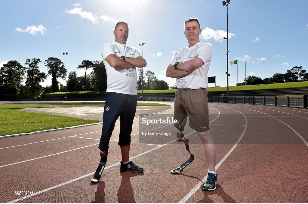 4 October 2014; Ted Smithers, left, from Santry, Dublin and Sean Baldwin, from Newbridge, Co. Kildare, pictured at the first ever running blades workshop held in Ireland hosted by Paralympics Ireland in partnership with sponsors Mondelez, and blade manufacturer Ottobock. The unique event saw eight individuals who had been prefitted for the technology given the opportunity to experience and showcase the blades with almost a fifty additional prosthesis users and amputees taking part in activity session to promote Paralympic sport. Morton Stadium, Santry, Dublin. Picture credit: Barry Cregg / SPORTSFILE