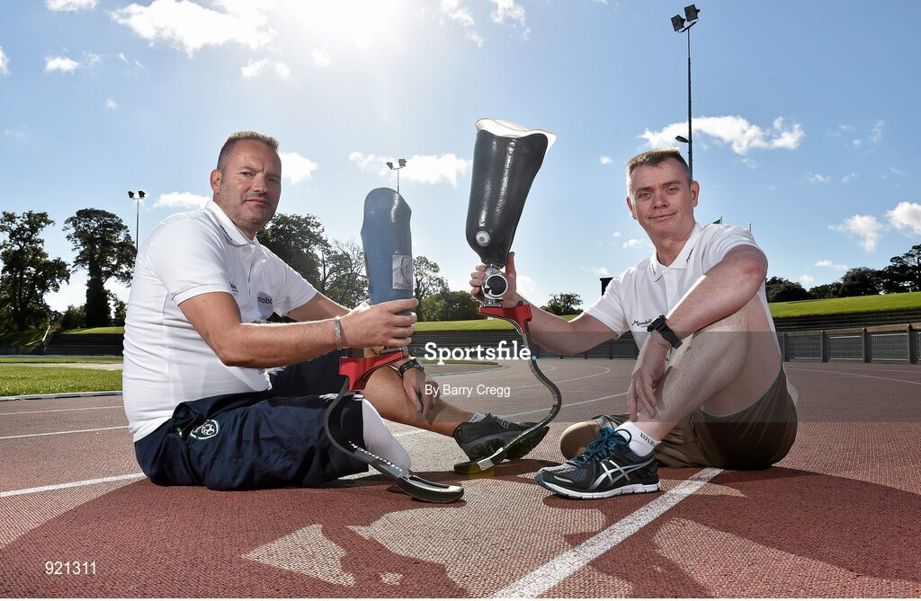 4 October 2014; Ted Smithers, left, from Santry, Dublin and Sean Baldwin, from Newbridge, Co. Kildare, pictured at the first ever running blades workshop held in Ireland hosted by Paralympics Ireland in partnership with sponsors Mondelez, and blade manufacturer Ottobock. The unique event saw eight individuals who had been prefitted for the technology given the opportunity to experience and showcase the blades with almost a fifty additional prosthesis users and amputees taking part in activity session to promote Paralympic sport. Morton Stadium, Santry, Dublin. Picture credit: Barry Cregg / SPORTSFILE