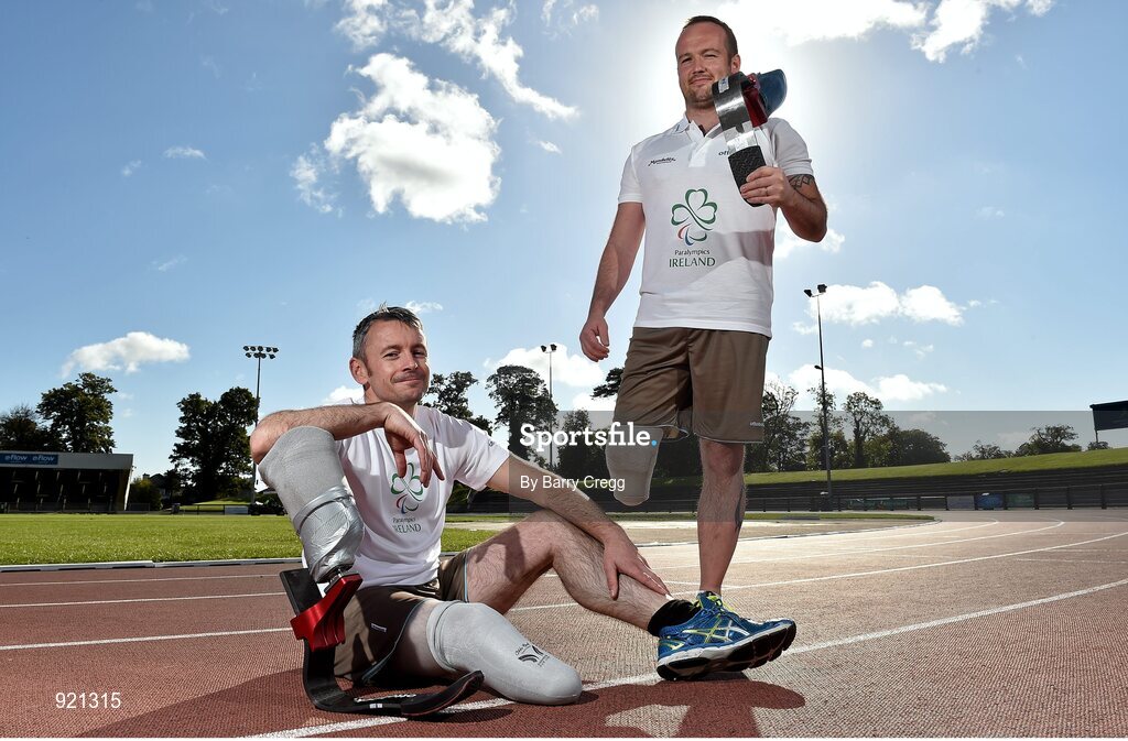 4 October 2014; Garry Hoey, left, from Dundalk, Co. Louth, and Paul Mckenna, from Carbury, Co. Kildare, pictured at the first ever running blades workshop held in Ireland hosted by Paralympics Ireland in partnership with sponsors Mondelez, and blade manufacturer Ottobock. The unique event saw eight individuals who had been prefitted for the technology given the opportunity to experience and showcase the blades with almost a fifty additional prosthesis users and amputees taking part in activity session to promote Paralympic sport. Morton Stadium, Santry, Dublin. Picture credit: Barry Cregg / SPORTSFILE