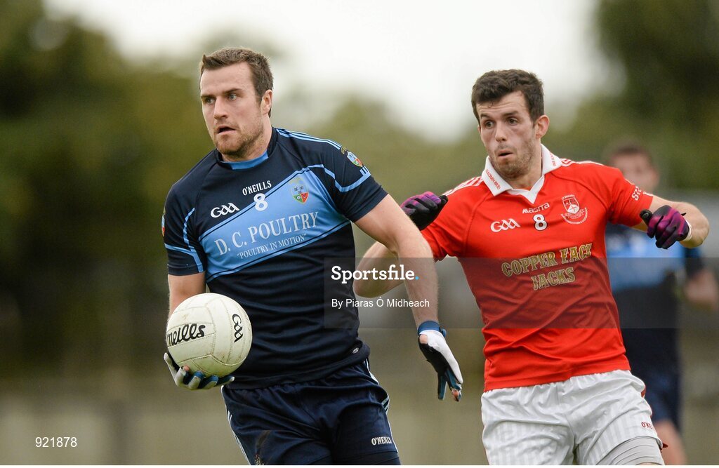 5 October 2014; Colm Murphy, St Judes, in action against Cian Mullins, St Brigids. Dublin County Senior Championship Quarter-Final, St Judes v St Brigids. O'Toole Park, Crumlin, Dublin. Picture credit: Piaras Ó Mídheach / SPORTSFILE