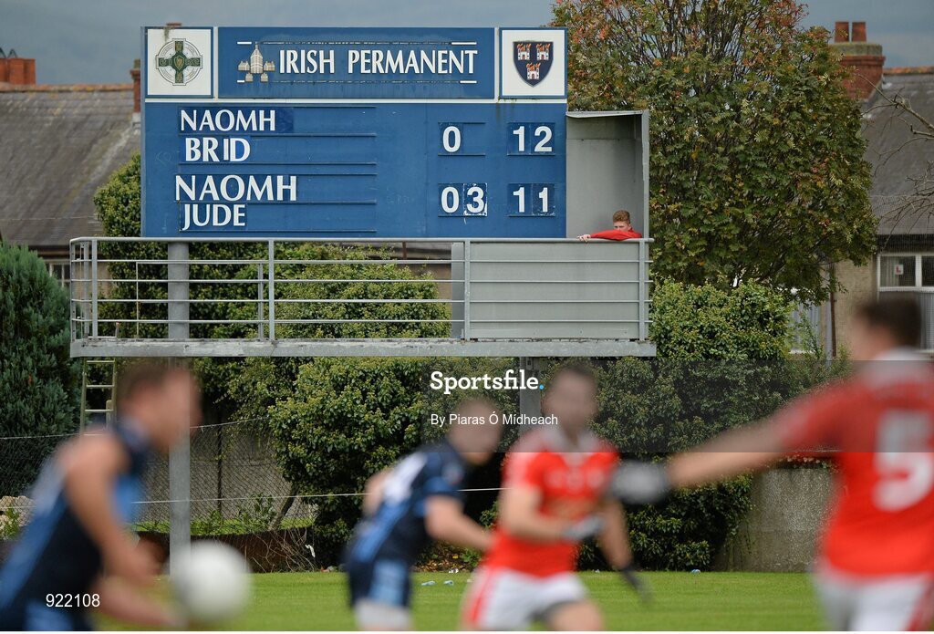 5 October 2014; A general view of the scoreboard near the end of the game, showing the full-time score. Dublin County Senior Championship Quarter-Final, St Judes v St Brigids. O'Toole Park, Crumlin, Dublin. Picture credit: Piaras Ó Mídheach / SPORTSFILE