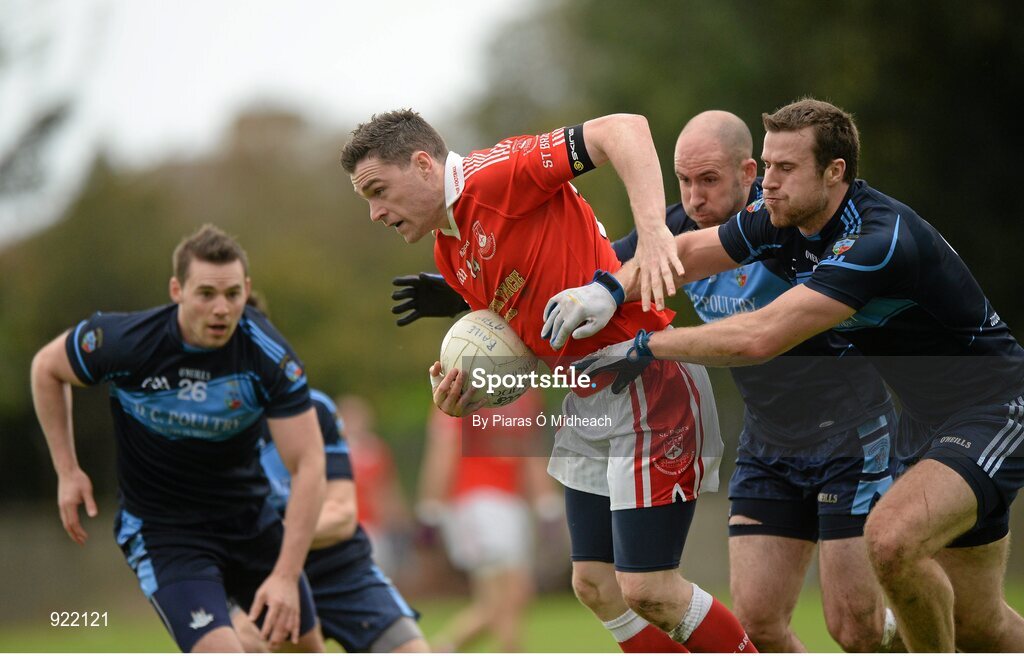 5 October 2014; Paddy Andrews, St Brigids, in action against Colm Murphy, right, Paul Cunningham and Chris Gurkian, left, St Judes. Dublin County Senior Championship Quarter-Final, St Judes v St Brigids. O'Toole Park, Crumlin, Dublin. Picture credit: Piaras Ó Mídheach / SPORTSFILE
